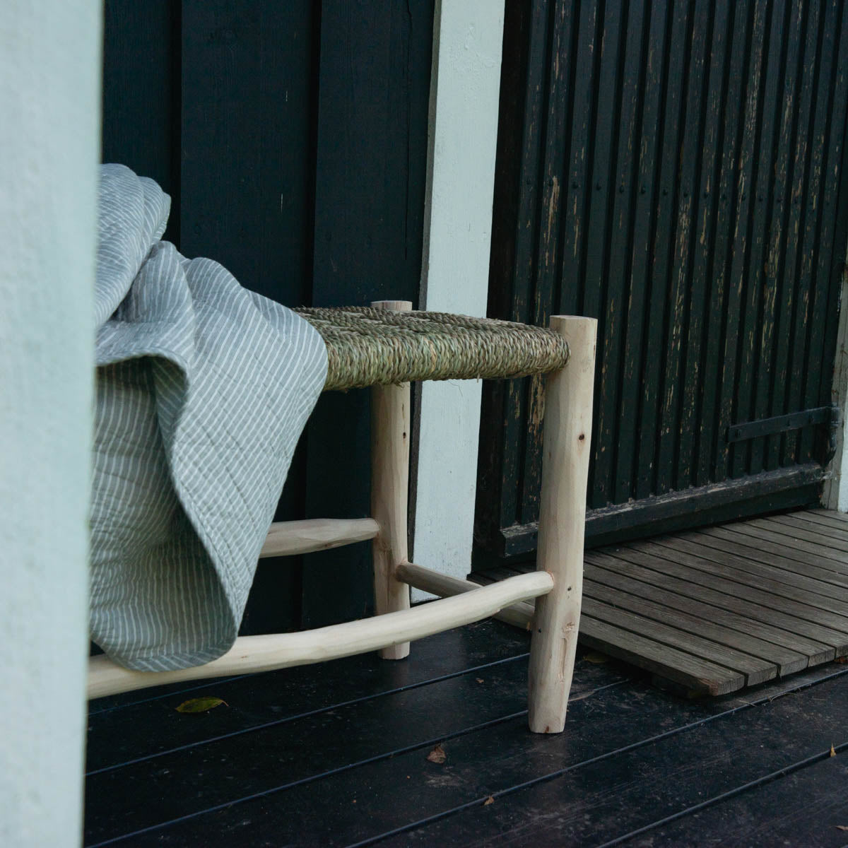 Vores håndlavede skamler og bænke er fremstillet af eucalyptus træ. Sæderne er flettet i raffia, som er en slidstærk og holdbar type af palmeblade.